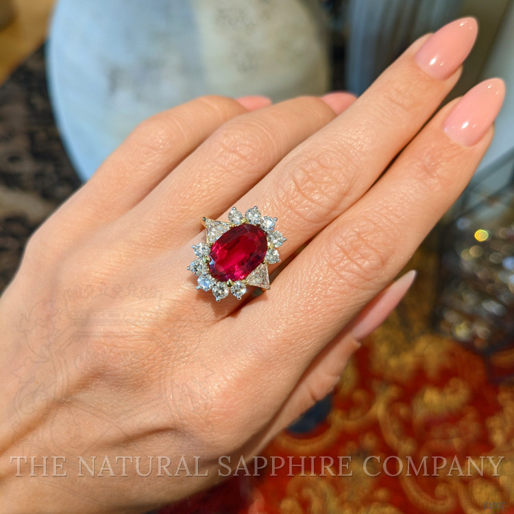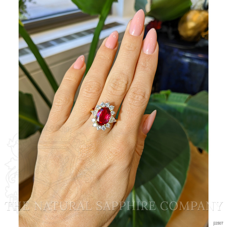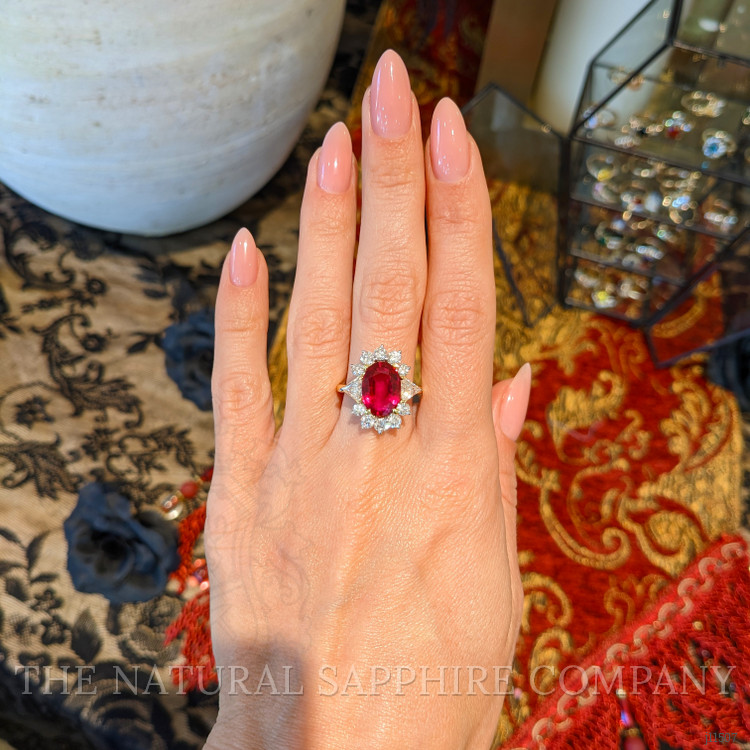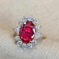 When you are searching for the ring that will finally bring your search to rest, you need a piece that answers both the heart and the eye, a ring that speaks of commitment while offering unrivaled beauty. This ring, set entirely in 18K yellow gold, arrives as that very answer, an elegant balance of warmth and fire that feels at once timeless and profoundly personal. At its center rests a luminous oval red gemstone that captures and returns light with a depth that draws the gaze and holds it. Surrounding that central gemstone is a constellation of sparkling stones, arranged like petals of a bloom, each facet catching light to create movement and life. The rich hue of the central stone, paired with the radiant white of the surrounding accents, creates a contrast that reads as passion tempered by clarity, a visual promise of devotion. If you want an engagement ring that speaks as loudly as your intentions, or a rare treasure that will sit proudly at the heart of your collection, this ring presents itself as the perfect solution.