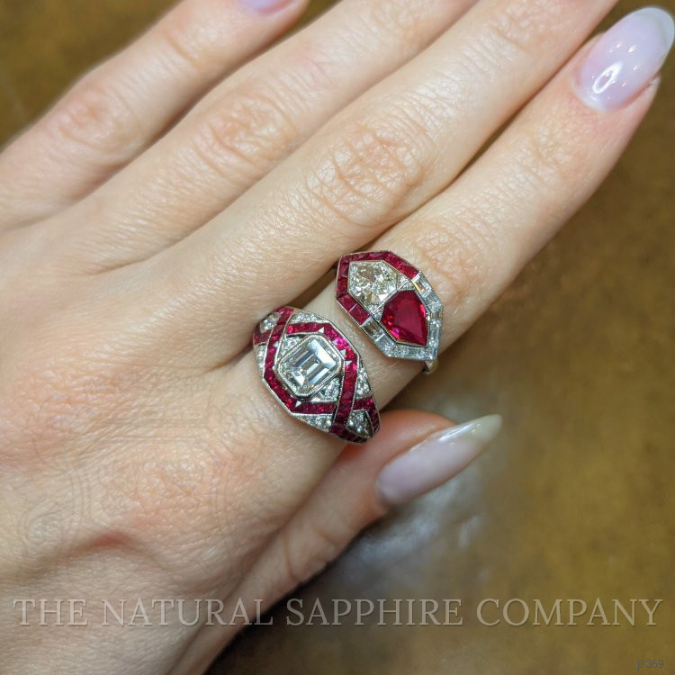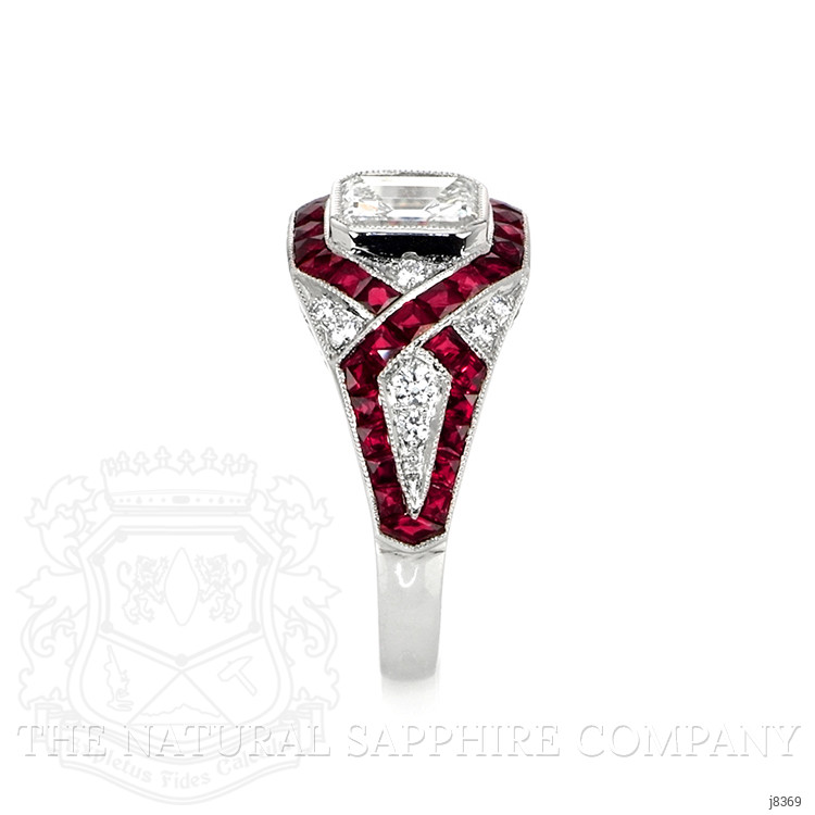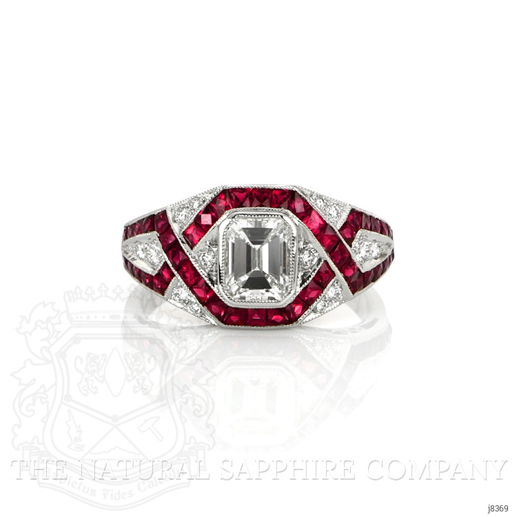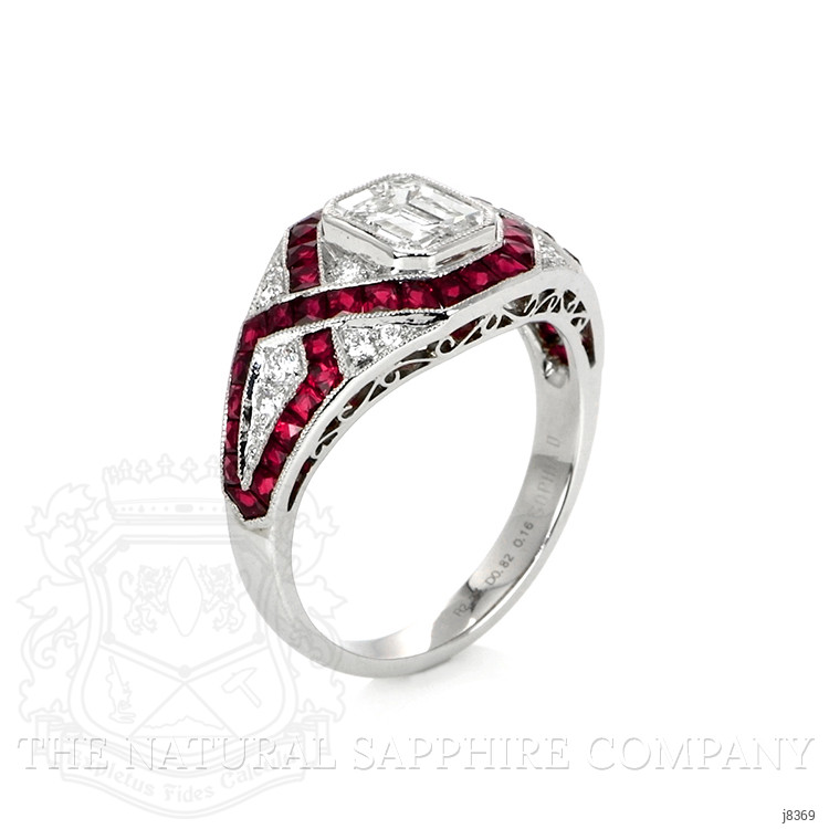 The ring primarily features with 46 red princess shaped princess cut rubies, weighing a total of 2.36 carats. The rubies have a clarity grade of very slightly included, and color saturation of vivid. Featured in the ring are 1 white emerald cut shaped step cut natural diamonds, weighing a total of 0.82 carats. The natural diamonds have a clarity grade of vs1 - Very Slightly Included., F color Also featured in the ring are 14 white round shaped mixed brilliant cut natural diamonds, weighing a total of 0.16 carats. The natural diamonds have a clarity grade of vvs1 - Very Very Slightly Included., F color The ring is entirely set in platinum 950.