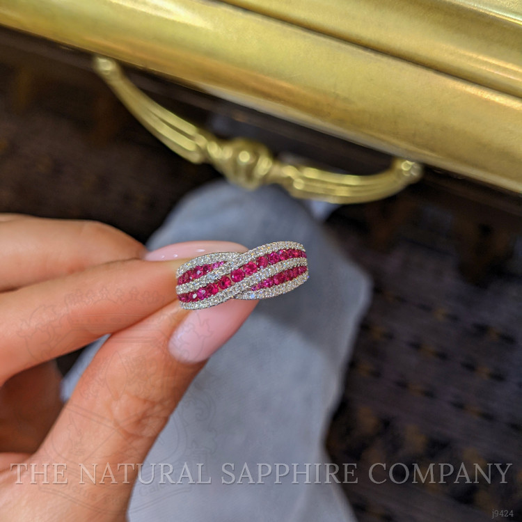 The ring primarily features with 43 red round shaped mixed brilliant cut rubies, weighing a total of 0.81 carats. The rubies have a clarity grade of eye clean, and color saturation of vivid. Also featured in the ring are 90 white round shaped brilliant cut natural diamonds, weighing a total of 0.49 carats. The natural diamonds have a clarity grade of vs2 - Very Slightly Included., F color The ring is entirely set in 18K white gold.